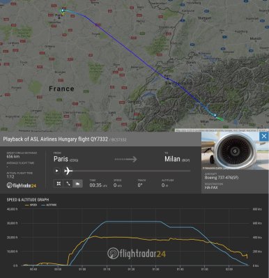 | A flightradar24 ADS-B adatai. A kék görbe a magasság, a narancs a földhöz képesti sebesség. |