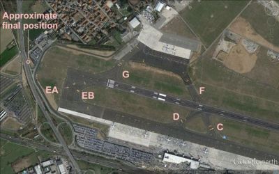 | Szemtanúk szerint a gép a D és G gurulók közt ért földet ezután a pályaküszöbtől 520 méterre állt meg gyorsforgalmi úton. | (AVH/Google) |