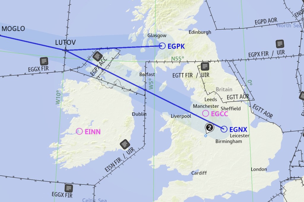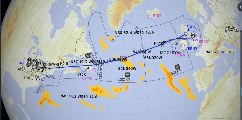 Eseménytelen repülés közben folyamatosan ellenőriztem az EastMidlands -i időjárást, látszólag minden rendben volt, nem látszott rajta az, ami egyébként a valóság volt. Az óceán “közepét” elhagyva, ami a 30West hosszúsági kör keresztezést jelenti, az éjszakába hajnalt hasítva landolt az ACARS üzenet a cégtől. (Az ACARS-on jönnek-mennek az üzenetek a gép és cég között. Mint egy SMS, csak smile és “kapjátok be” jelek nem küldhetők) Ezek szerint, a leleményes diszpécser azt találta ki, hogy mivel a rendeltetési repülőterünk továbbra is zárva tart, (OMG, erről nem volt szó) a kitérőnk nem elérhető (és a DHLnek sem jó), valamint Stansted tele már van más kitérőre érkezett gépekkel, ezért menjünk el Prestwickbe. Rögtön tudtuk, hogy kezdők a nyomás a személyzeten.