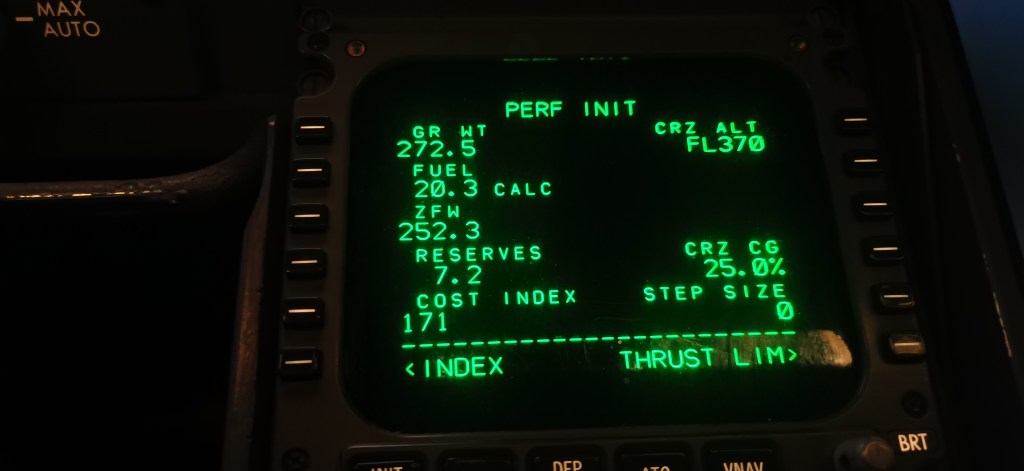 Ezt volt az én “éjti sziksz” tonnám, magyarul rátettem 5400 kg-ot. Ebből valójában nem marad, csak nagyjából 5000, mert a kerozin cipelésének (tankering) is van ára. Ennek ellenére marad extra 20 perc, összesen majd 40 perc várakozási időnk (holding) az eltervezett 20 perchez képest.