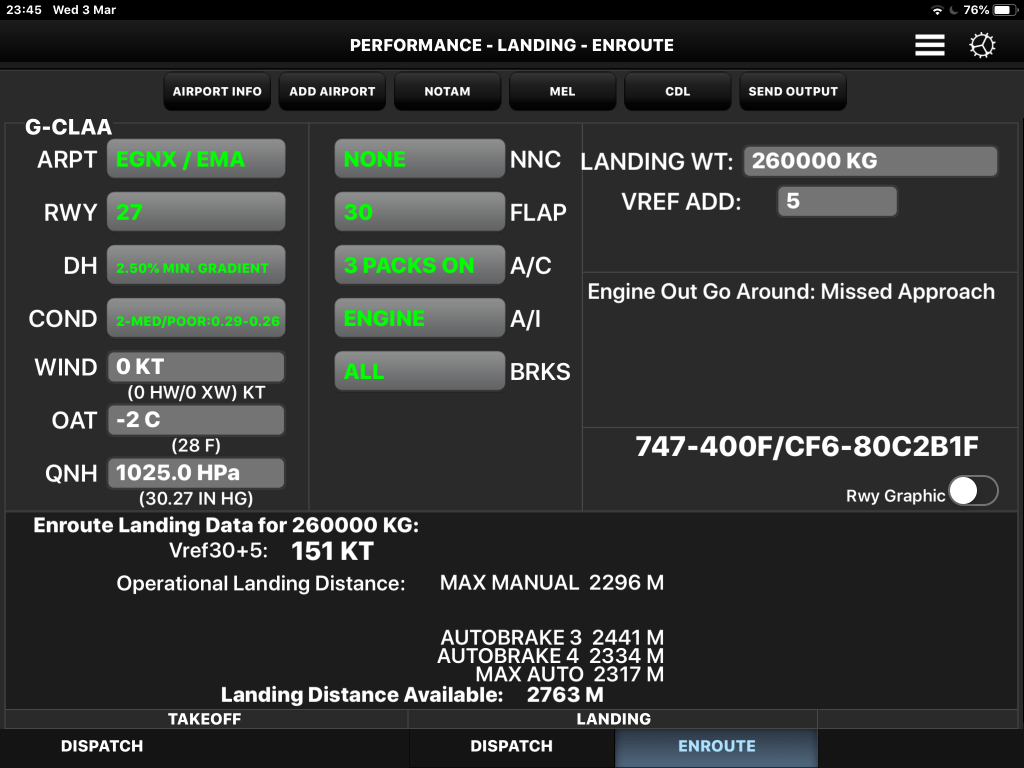 Volt még egy nehézség is, amit még nem említettem, az pedig a pályaállapot hivatalos értéke. A leszállás kisszámításánál figyelembe kell venni azt, hogy a pálya mennyire síkos, mennyire tapadnak majd a kerekek. Ebből látható az, hogy valójában hol állunk meg a pályán, mennyi a tartalékunk, ha egy picit hátrább érnénk földet a pályán, illetve hogy mekkora fékerővel kell számolni hogy a pályán maradjunk.