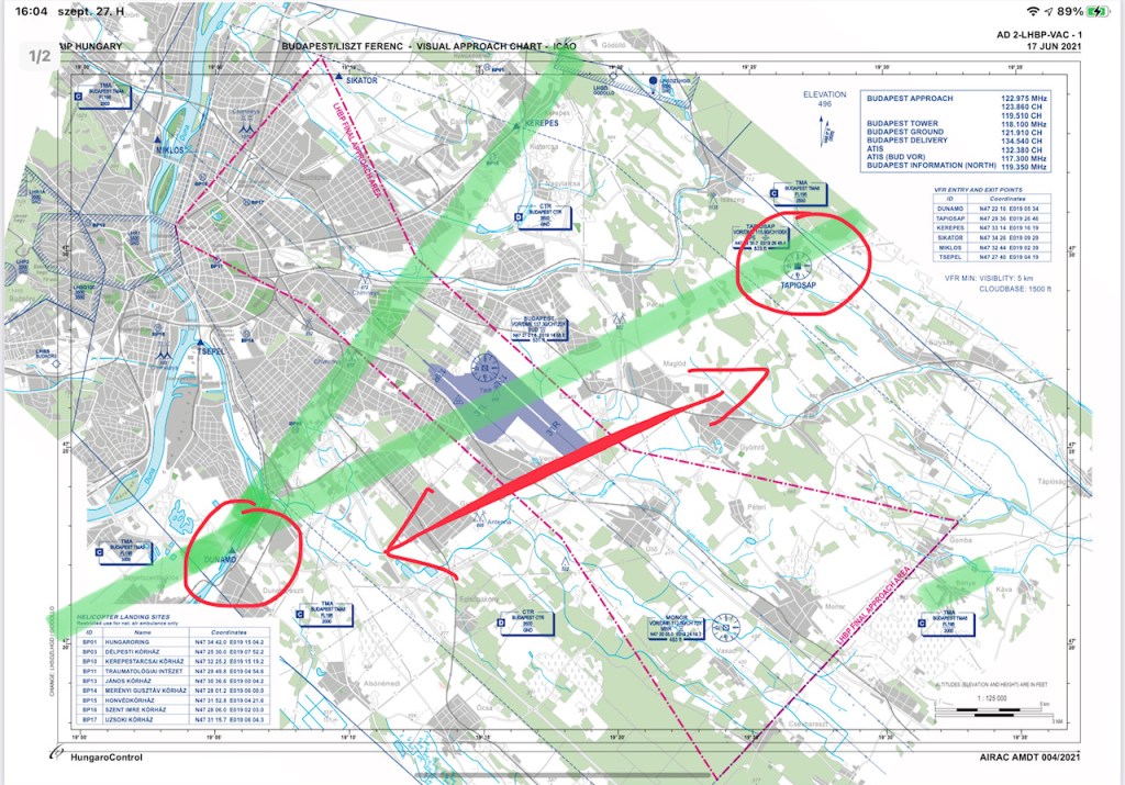 Belépéshez DUNAMO pont javasolt, amiről egyenesen Tápiósáp VOR-ra kell repülni. Ez, a DUNAMO-TPS egyenes, éppen a 31/13 pálya-pár felett halad el, aminek az a jelentősége, hogy elkülönítést biztosít mind az induló, mind az leszálló/ átstartoló légijárművektől.